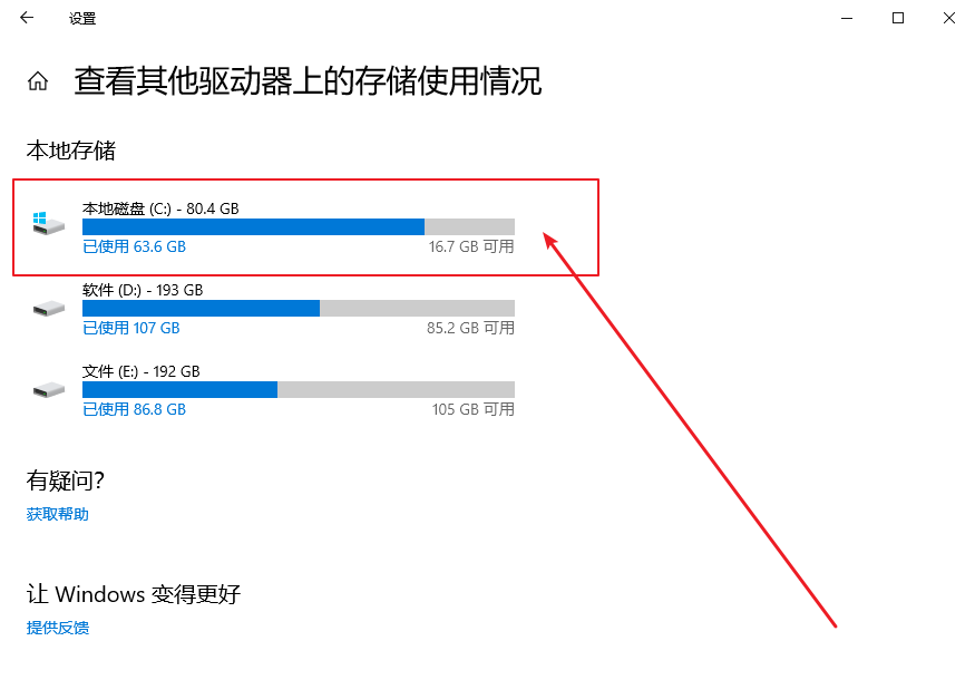 3、在查看其他驱动器上的存储使用情况页面中,选择点击“C盘”