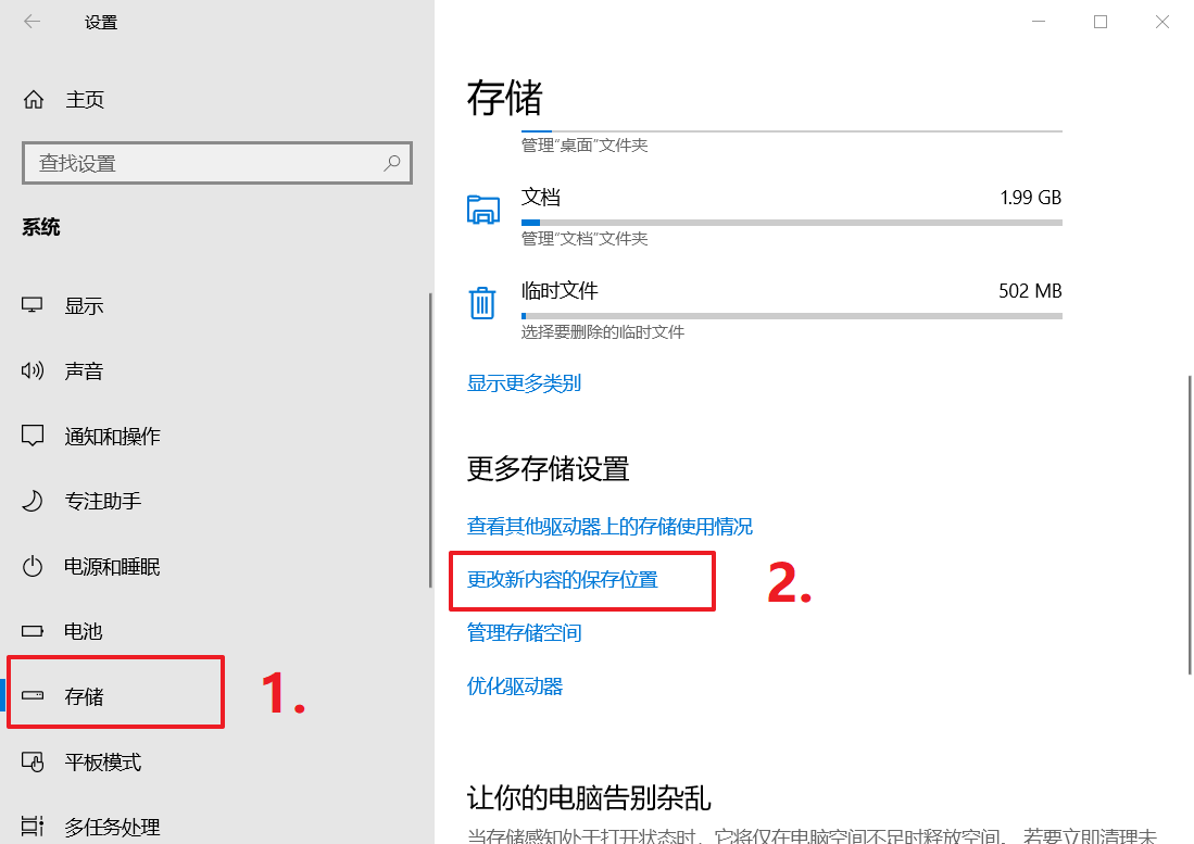 3、在系统设置页面中,依次点击左侧的“存储”以及右侧的“更改新内容的保存位置”