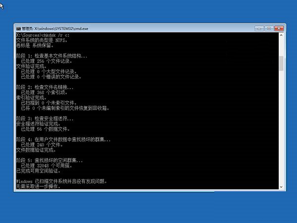 8、最后输入chkdsk /r c:回车,系统会自动检查文件系统错误。检查完成之后再重启电脑,一般情况下即可恢复正常