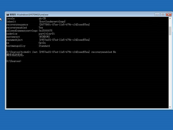 7、接着输入bcdedit /set {GUID} recoveryenabled No回车运行,运行该命令后就会暂时禁用系统的自动启动修复功能,其中的{GUID}即为上一步中记录的字符