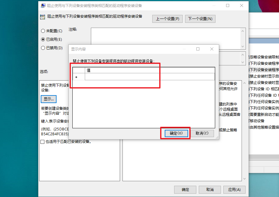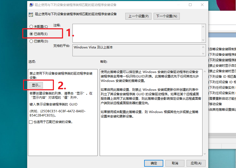 5、 进入编辑页面之后,先勾选“已启用”,再点击“显示”,并输入设备的类GUID,点击“确定”(注意:不要勾选“也适用于匹配已安装的设备”)