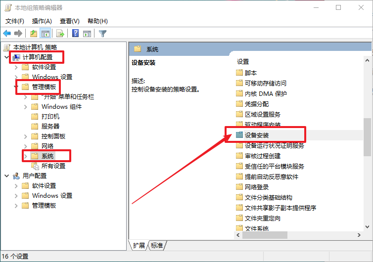 3、 点击系统文件夹后,在右侧找到并双击打开“设备安装”文件夹,再继续打开“设备安装限制”