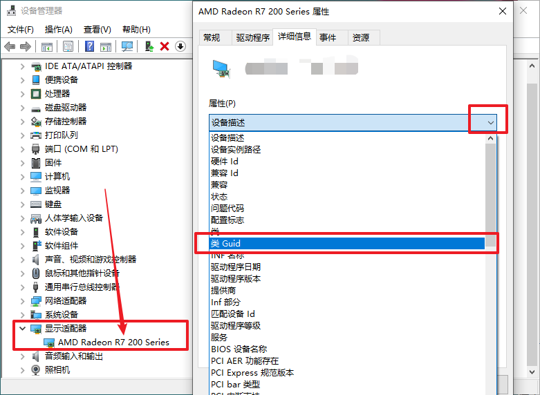 7、然后在设备管理器页面中,找到并双击需要停止更新的显卡设备,点击切换至“详细信息”,在下拉菜单中找到类GUID即可查看