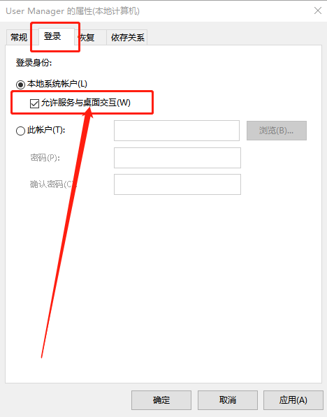 3、 之后,切换至“登陆”选项页面,勾选“允许服务与桌面交互(W)”并点击“确定”。