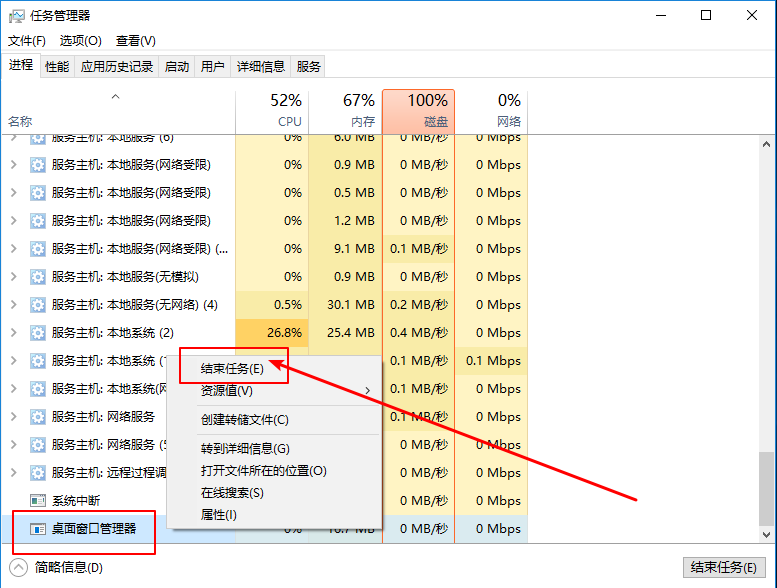 2、然后,在任务管理器页面中,找到“桌面窗口管理器”,右键“桌面窗口管理器”,点击“结束任务”。