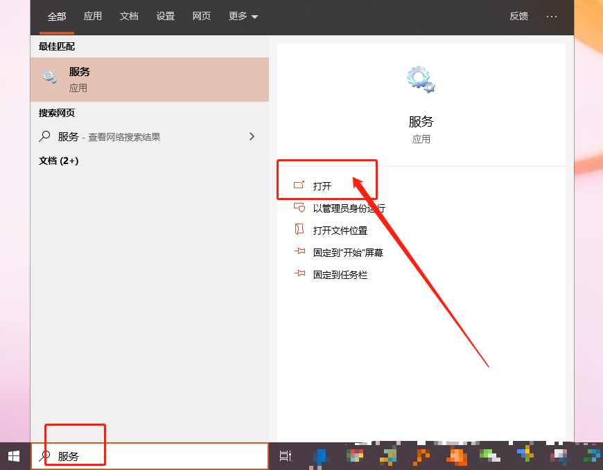 1、 在电脑桌面搜索框中,输入并打开“服务”