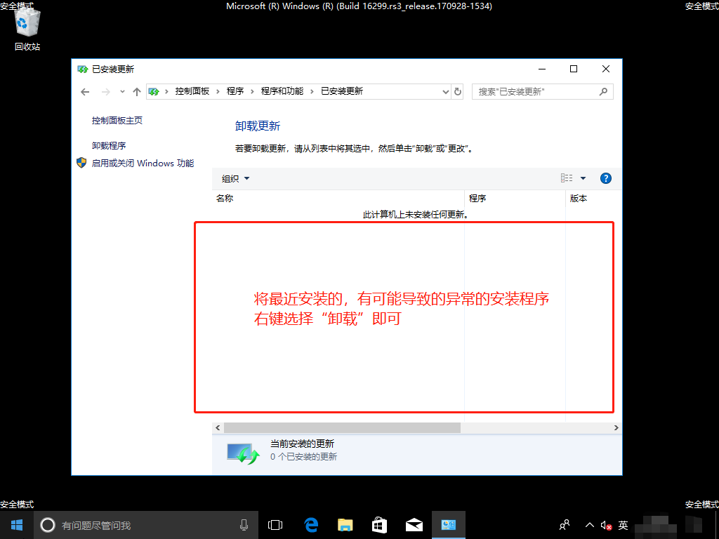 进入安全模式,打开“控制面板”选择“程序与功能”;然后点击左侧的“查看已安装的更新”,将最近安装的,有可能导致的异常的安装程序,右键选择“卸载”即可