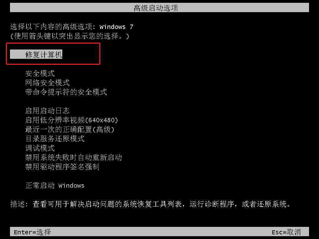 重启电脑或开机,在开机画面出现时不断的按下“F8”键,进入高级启动选项页面;选择“修复计算机”并回车,然后电脑会开始进行系统的全盘扫描以及修复。这个时间比较长,要耐心等待。