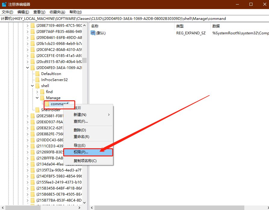 【HKEY_LOCAL_MACHINE\SOFTWARE\Classes\CLSID\20D04EF0-3AED-1069-A2D8-08002B30309D\shell\Manage\command】
