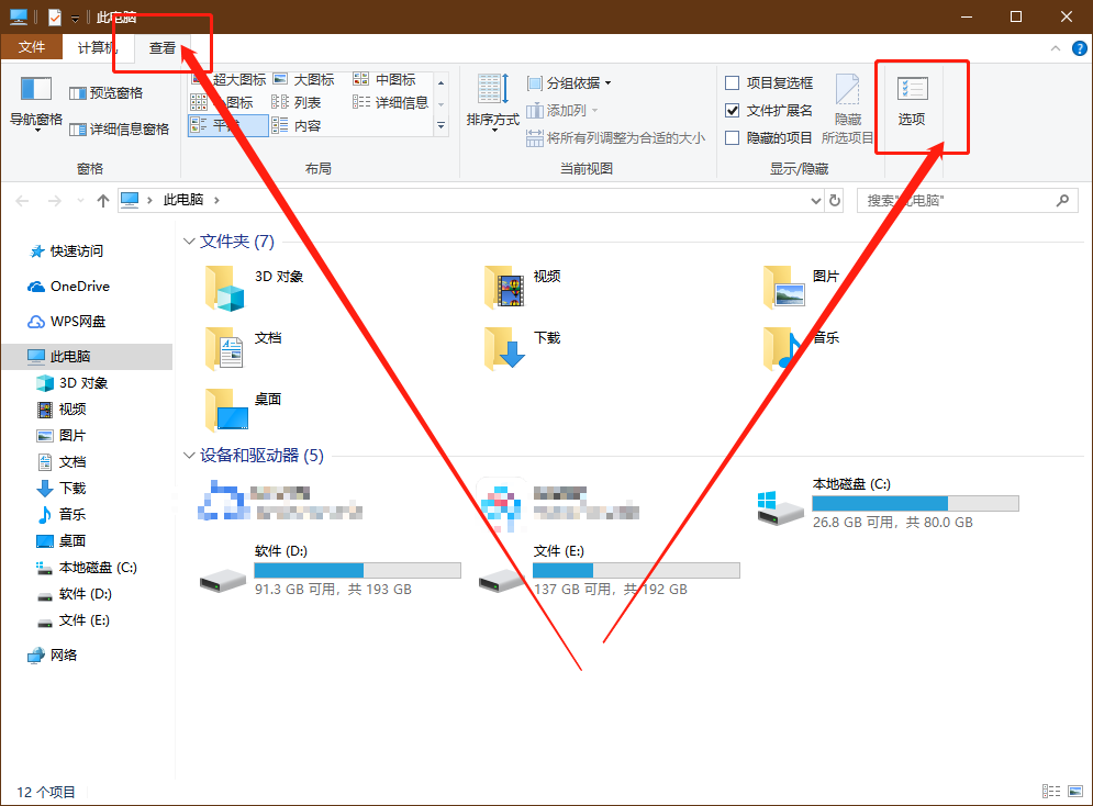 第一步:打开“此电脑”,点击页面上方的“查看”并点击“选项”