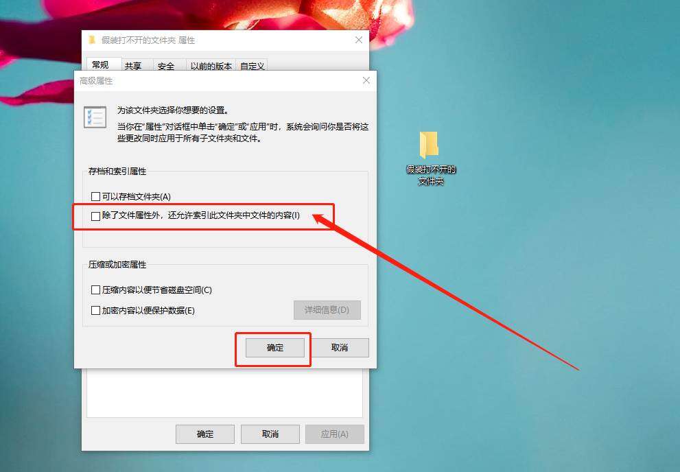 第六步:进入高级属性页面后,取消勾选“除了文件属性外,还允许索引此此文件夹中文件的内容”,点击“确定”。回到属性页面,继续点击“确定”即可。