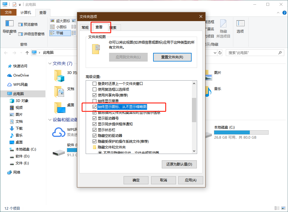 第二步:进入文件夹选项页面后,切换至“查看”选项卡,在高级设置框中,勾选“始终显示图标,从不显示缩略图”