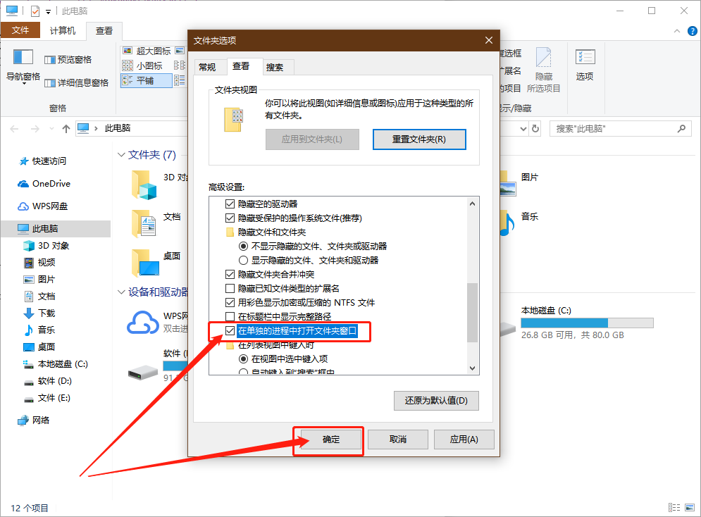 第三步:随后,继续在框中勾选“在单独的进程中打开文件夹窗口”,点击“确定”