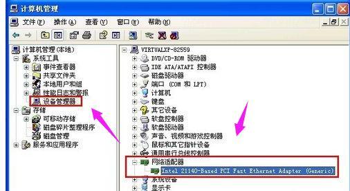5.打开“计算机管理”窗口,在左侧的控制台树单击系统工具下的“设备管理器”项,然后在右边窗口展开“网络适配器”,出来的项目双击打开网卡。
