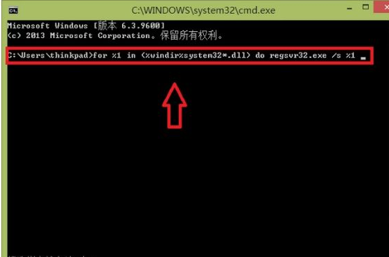 之后,再次输入for %1 in (%windir%system32*.dll) do regsvr32.exe /s %1,然后按Enter键。