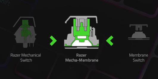 雷蛇的轻机械键盘主要是在薄膜键盘的薄膜层上加入了一个固定器,限制键帽左右晃动,只能进行单向上下运动。从而大大提升了敲击的手感。在解决了薄膜键盘的松松垮垮的问题之后,雷蛇又在键盘的上下轨道中加入了一个金属弹片,从而模仿机械键盘敲击时产生的清脆声音,一定程度上还能增加键盘的段落感。