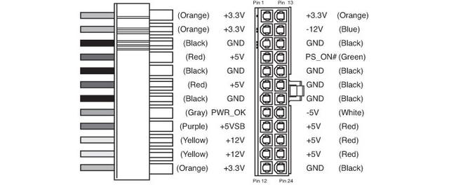 最后就是最大的接口,也就是即将被取缔的接口,主板24PIN供电接口,这个接口的供电十分复杂,一眼看去,全都是为了5V、3.3V设计的供电接口, 因为主板上的各种芯片主要是用到5V以及3.3V供电,例如内存插槽就是3.3V、USB接口为5V。