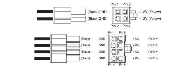 然后就是我们CPU和显卡的命脉,4PIN、6PIN、8PIN的供电接口了,这些接口只输出12V的直流电,因为显卡和CPU的功耗极高,所以他们的12V供电是独立供电的,部分功耗较低的显卡甚至不用外接独立供电,只需要从PCIe插槽上取电即可。PCIe插槽也可以提供最大75W的12V直流电输出。