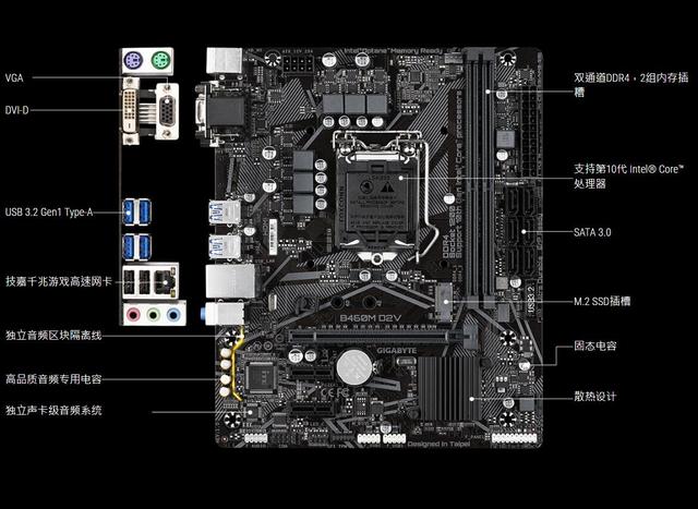 技嘉B460M D2V采用了MATX版型设计,供电规格是六相供电模组,双DDR4内存插槽,带一个m.2接口,支持PCIe 3.0 x4通道NVMe协议的固态硬盘,也就是满速m.2固态。