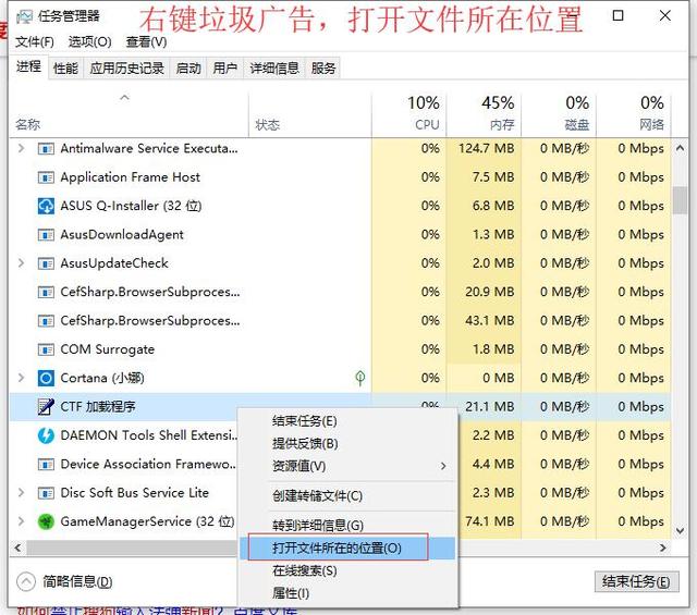 当出现垃圾广告的时候,我们先不要着急点击关闭。此时打开任务管理器,找到正在运行广告程序,右键打开文件所在位置。这样就找到了垃圾广告的源头!