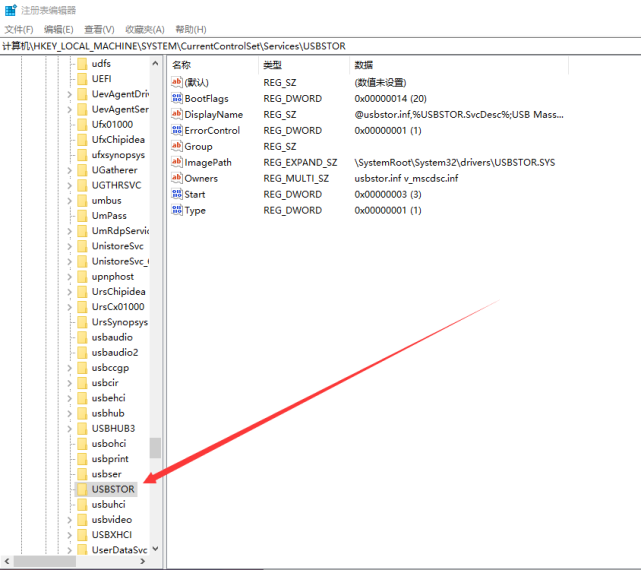 步骤四、依次打开“HKEY_LOCAL_MACHINE>SYSTEM>CurrentControlSet>Services>USBSTOR”。