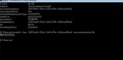 5、输入bcdedit /set {resumeobject字符串} recoveryenabled No,回车执行,暂时停止系统自带的自动修复功能;