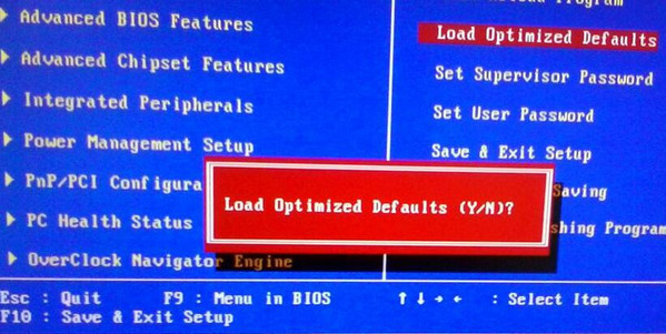 一般台式机开机按delete键,笔记本开机按f2进入 bios setup设置界面,然后选择Load Optimized Defaults然后按y键表示同意,重启电脑即可修复。