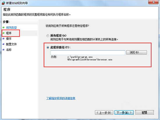 4、我们在新建规则下选程序,再选此程序的安装路径。