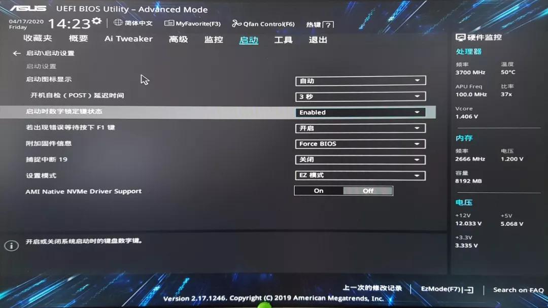 有些主板为了安全默认禁用了小键盘,就需要在 BIOS 中修改。不同制造商的主板进 BIOS 的方法不同,通常是开机的时候按 DEL 或 F2 或 F8,请自行查找进 BIOS 的方法;以我的华硕主板为例: