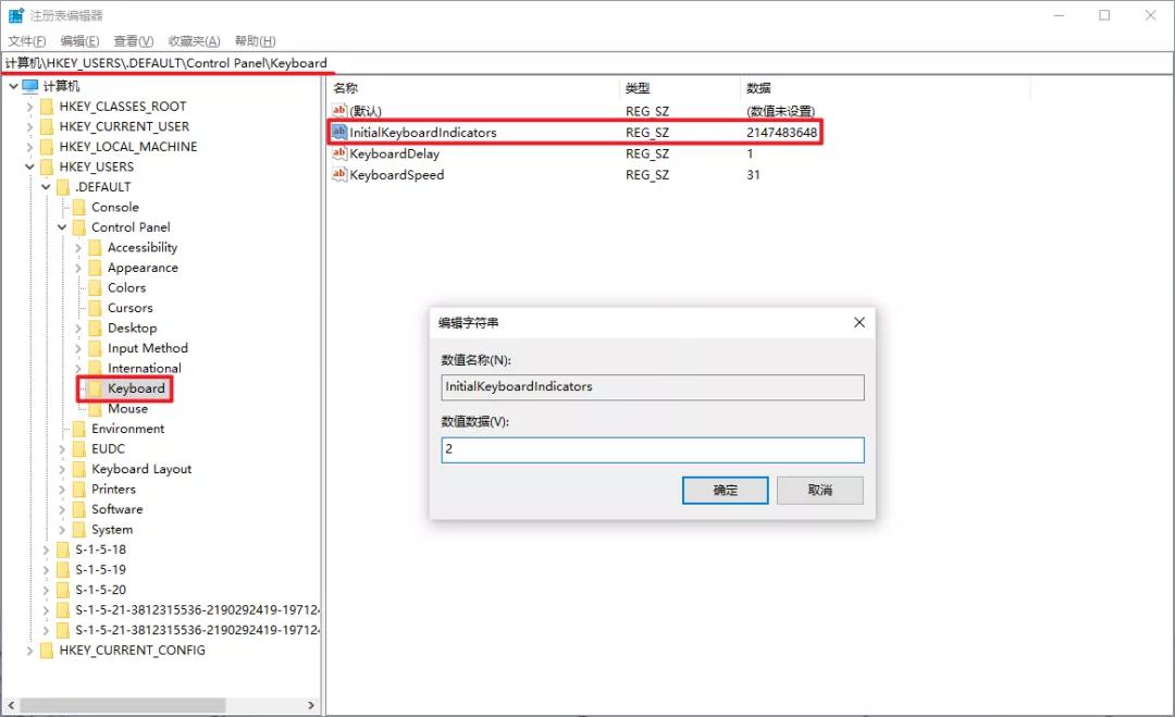 然后找到 HKEY_USERS\.DEFAULT\ControlPanel\Keyboard;重复上面上面的操作,备份,然后把 InitialKeyboardIndicators 修改成 2。