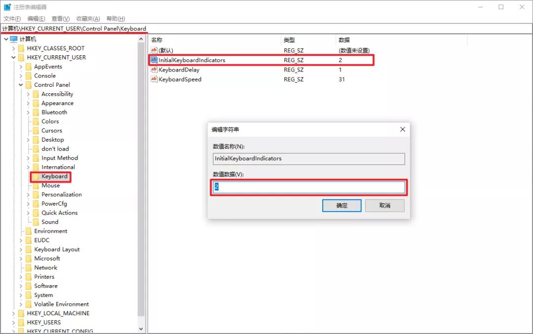 双击打开右侧的 InitialKeyboardIndicators ,将数值数据修改为2。