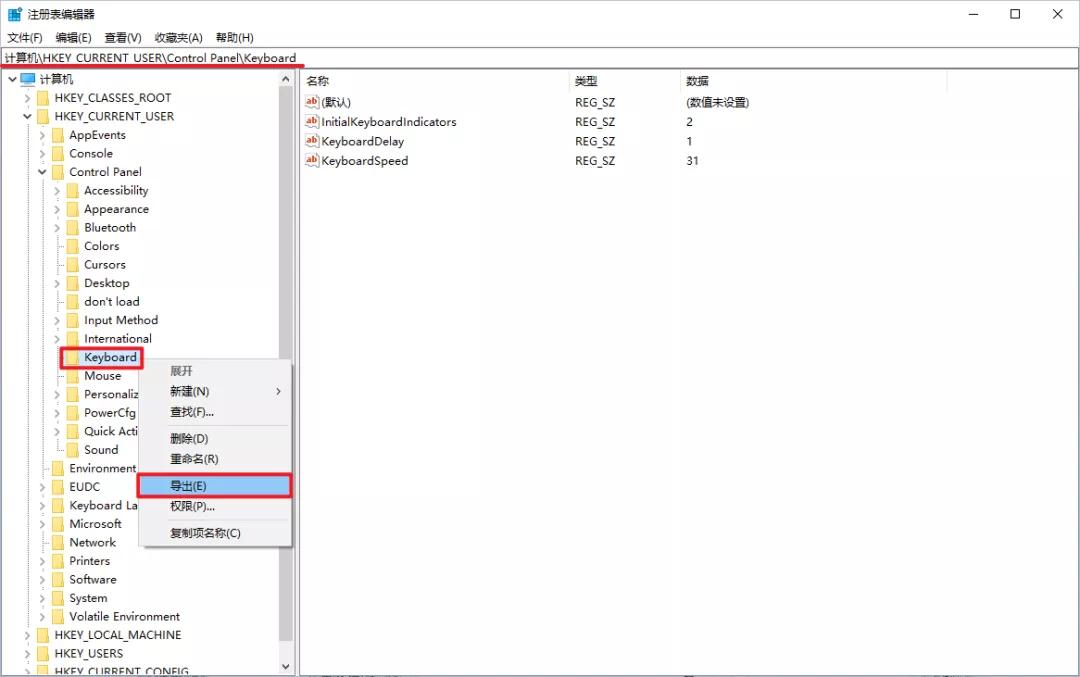 找到 HKEY_CURRENT_USER\Control Panel\Keyboard;保险起见,右键 Keyboard 导出,备份一次注册表;