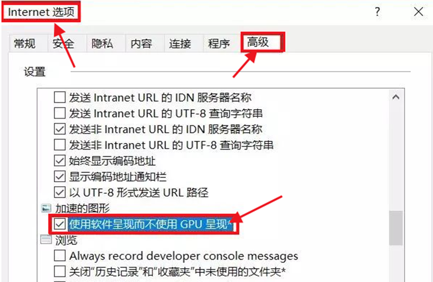 这时,我们可以进入电脑自带的Internet浏览器,点击【Internet选项】,点击【高级】,勾选【使用软件呈现而不使用GPU呈现】选项,点击【确定】后重启浏览器即可。