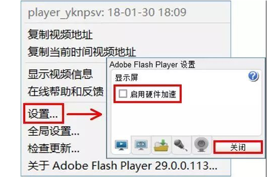 在出现花屏的视屏页面,右键点击,在弹出的页面中,点击【设置】选项。在弹出的选项窗口,取消【启动硬件加速】的勾选,再点击【关闭】按钮就可以了。