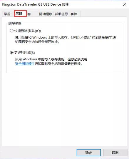 U盘“策略”设置可右击U盘所在盘符选择【属性】,依次点击U盘【属性】【常规】【改变设置】进入)。