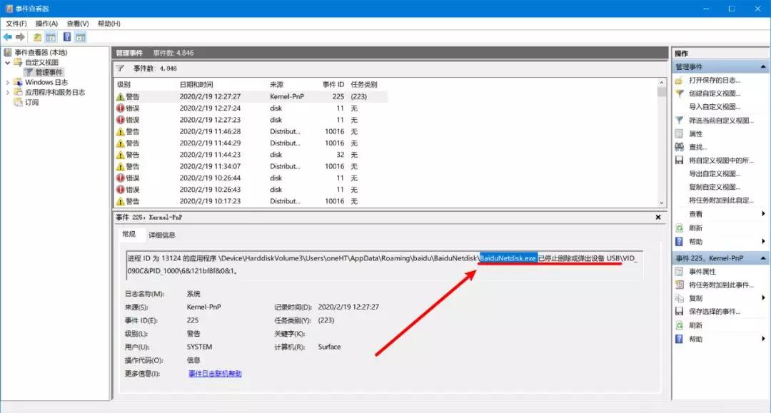 打开 事件查看器 – 自定义视图 – 管理事件,然后弹出u盘,事件查看器会刷新刚才的错误,并显示那个程序所致。