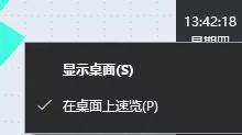 然而,有时候你会发现光把光标移动上去是不行的,还需要点击一下才能出现桌面。怎么回事呢?是因为桌面速览功能被关闭了。这个时候,只需右键单击桌面速览按钮,从弹出的菜单中选中“在桌面上速览”就可以了。