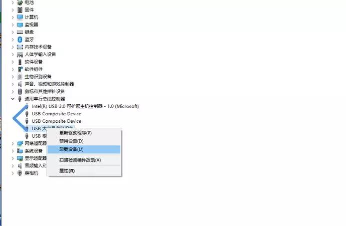 2、选择【USB大容量存储设备】,右击选择【卸载设备】,然后重启电脑,系统可以自动识别USB大容量存储设备。