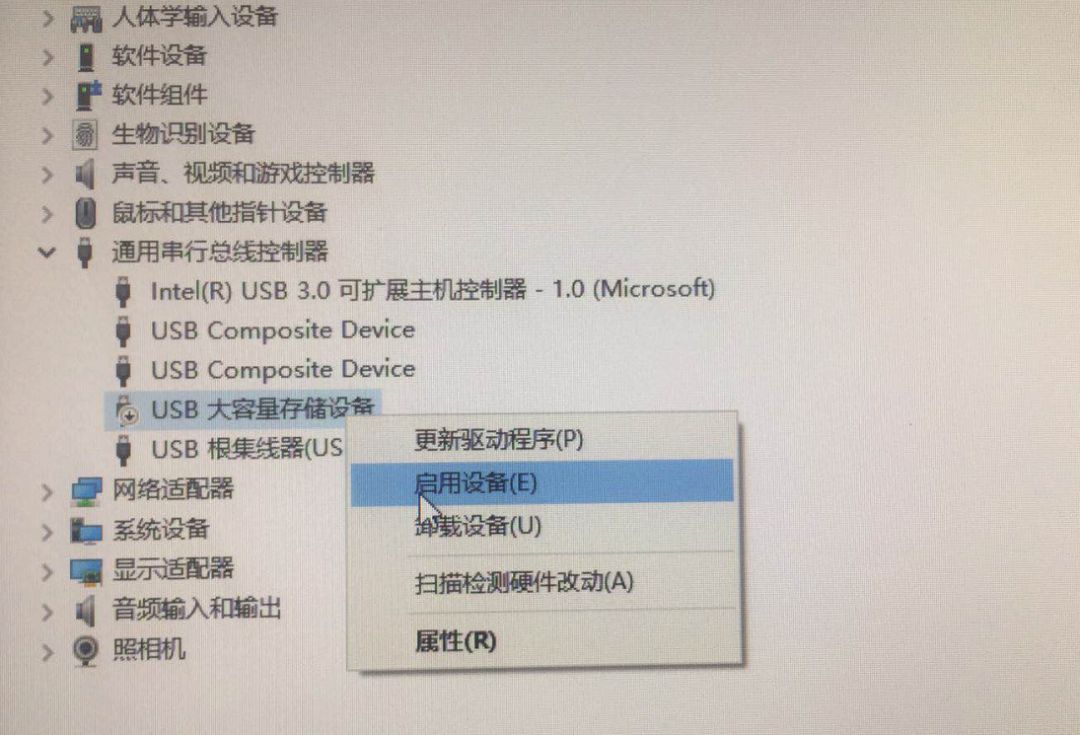 2、选择【通用串行总线控制器】-【USB大容量存储设备】-【启用设备】