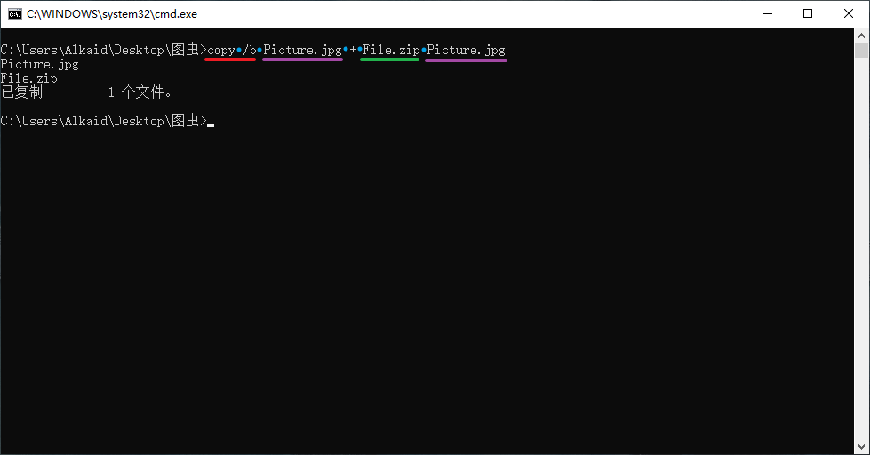 copy /b 图片名称 + 压缩文件名称 图片名称 (蓝点代表有空格)