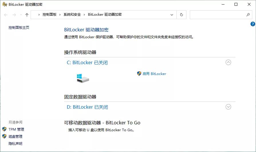 除此之外Windows 10 还自带有一个 BitLocker 加密功能,是对整个驱动器加密,开启加密后当前系统还是可以随意访问所有文件,但离开当前系统环境后,比如在 PE 中或拆下硬盘到其他电脑上都无法读取硬盘中的内容,BitLocker 是世界上最强加密之一,目前应该是无解的。