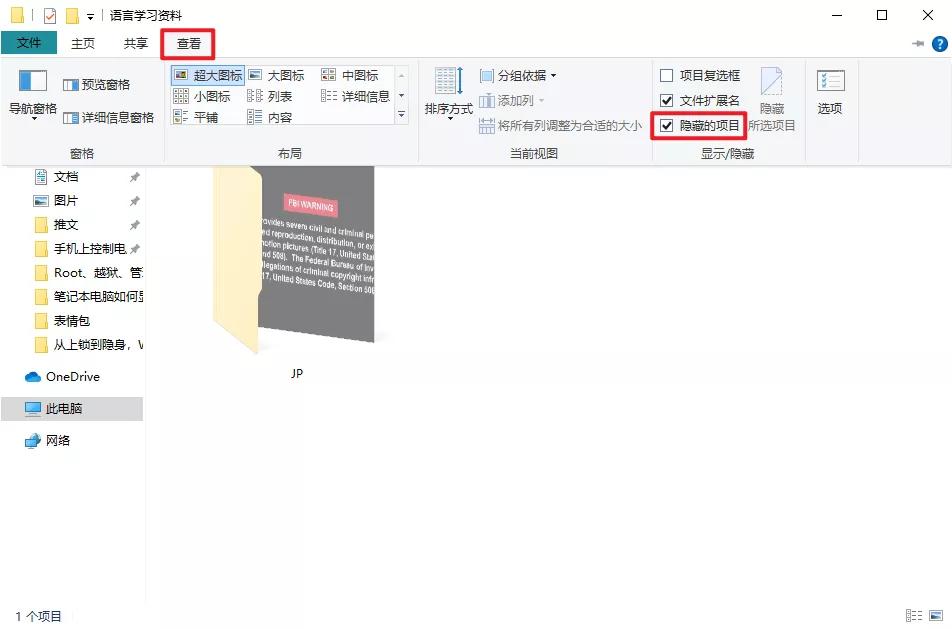 Windows 10 可以在查看中打开「隐藏的项目」,Windows 7则在组织 – 文件夹和搜索选项 – 查看 – 隐藏文件和文件夹。