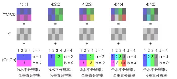 色度抽样用 J:A:B 表示:J:最小水平抽样的的宽度,一般为 4;A:最小水平抽样区域第一行的色度抽样;B:最小水平抽样区域第二行的色度抽样;