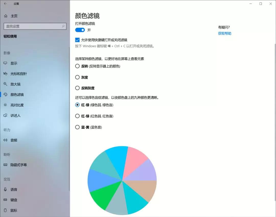 有红、绿、蓝三种模式, Windows 10会自动增减某种色彩的通量,来弥补色盲症用户的色彩查看的体验。虽然小众,对于有这方面需求的朋友来说,还是非常实用的。