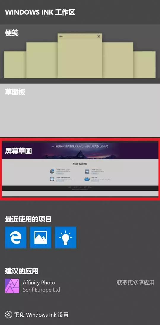 没有OneNote你还可以通过,WIN键+W 唤出 Windows Ink,其中的屏幕草图也是一个不错的截图工具。