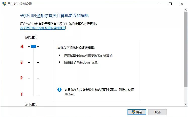 前面提到Windows 7开始的UAC通知有四个档位,第三档是Windows默认的,但是七号推荐大家使用第四档“始终提醒”。