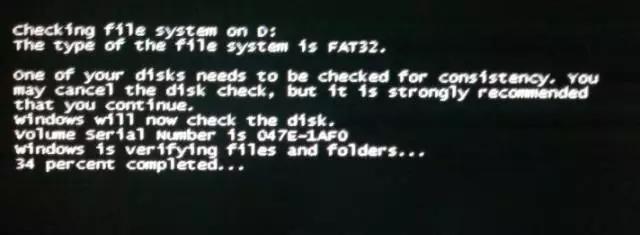 这种信息要注意最后的关键词,就是有个数字在走,然后是percent completed...比如上图34 percent completed是百分之三十四完成的意思。这也不算是错误,一般是电脑异常关机或者磁盘有坏道情况,然后开机的时候自动磁盘扫描自检,等扫描结束就好。如果这个过程很久很久都不能完成,你的硬盘应该是出问题了。
