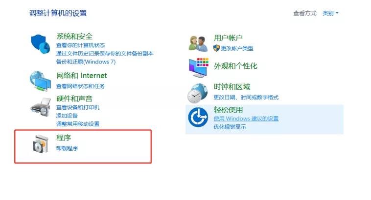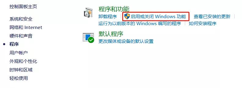 在进入“控制面板”后,打开“程序”,点击“启用或关闭Windows功能”这一选项。