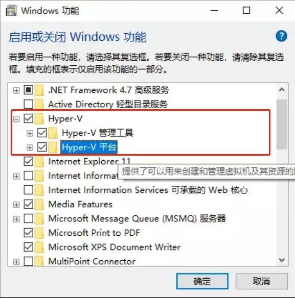 在打开的列表中,找到“Hyper-V”选项并将它勾选,然后点击“确定”。