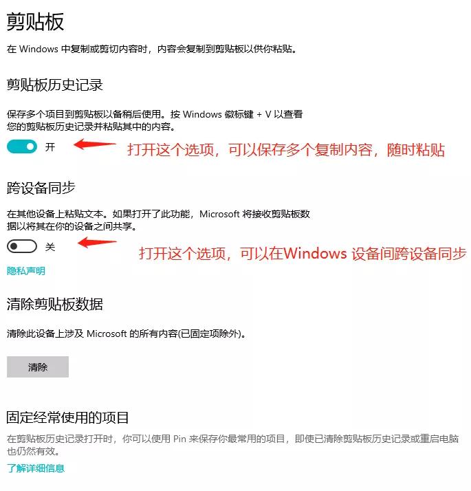 在设置面板里,剪贴板历史记录是可以让你同时剪贴多个内容,按Windows+V快捷键就可以打开剪贴板,里面的东西随时可以粘贴,不再需要每一次重新复制。